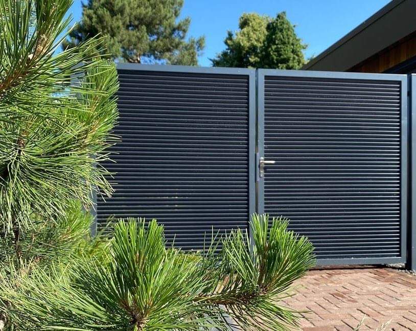 Met een robuust frame en lamellen van 100 mm breed is dit een prachtige poort.
